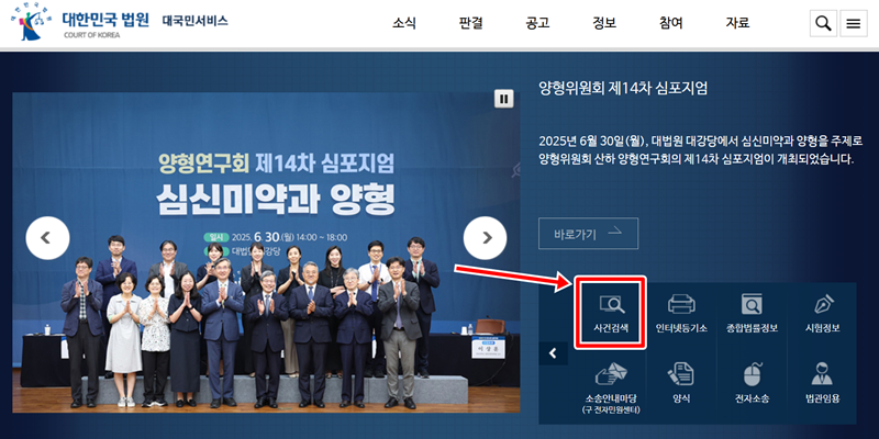 2. 대국민서비스 화면으로 이동하면 여러 가지 아이콘 형태의 목록이 나타납니다. 여기서 우측 하단에 위치한 '사건검색'을 선택하여 내가 알고자 하는 재판의 진행 상황을 찾아보는 과정을 시작할 수 있습니다.