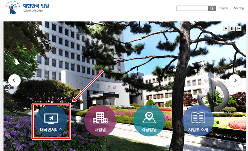 1. 대한민국 법원 홈페이지에 들어가면 여러 가지 안내 항목들이 보입니다. 그중에서 '대국민서비스'라는 부분을 선택하면 일반 시민들이 이용할 수 있는 다양한 법률 관련 정보와 절차를 안내받을 수 있는 화면으로 넘어가게 됩니다.