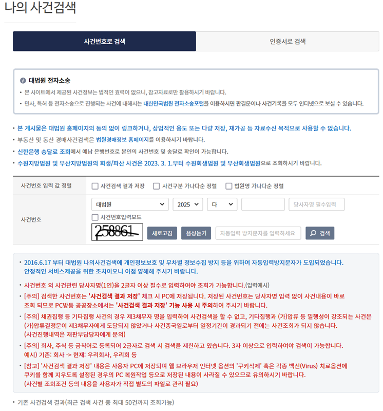 3. 사건번호를 알고 있다면 '사건번호로 검색'을 통해 알아볼 수 있습니다. 해당 재판을 담당하는 법원을 선택하고, 사건번호와 당사자명을 정확히 기입한 뒤, 자동으로 보이는 문자까지 입력하면 조회가 가능합니다.
