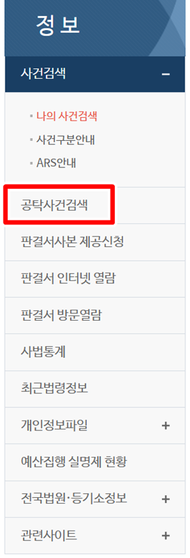 7. 일반적인 재판 조회 외에 금전 등을 맡겨두는 공탁과 관련된 내용을 찾아보고 싶다면 별도의 경로를 이용해야 합니다. 좌측 정보 목록에 있는 '공탁사건검색'을 통해 관련된 내용을 전문적으로 찾아볼 수 있습니다.