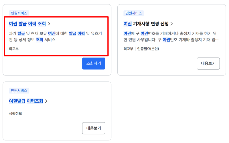 2. 검색 결과 화면에서 외교부가 담당하는 '여권 발급 이력 조회' 민원서비스를 찾아주세요. 여러 항목이 나올 수 있지만, 설명을 잘 읽어보고 해당되는 서비스를 선택하면 됩니다.