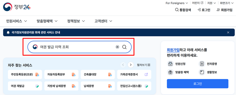 1. 홈페이지 중앙에 보이는 검색창에 '여권 발급 이력 조회'라고 입력한 뒤 검색을 진행해 주세요. 그러면 필요한 민원 서비스를 쉽고 빠르게 찾을 수 있습니다.