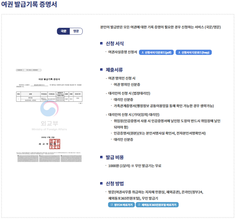 6. 조회가 완료되면 여권 발급 기록 증명서 견본과 함께 신청에 필요한 서류, 비용, 방법 등에 대한 안내를 확인할 수 있습니다. 국문 또는 영문으로 기록을 확인할 수 있으니 필요에 맞게 활용해 보세요.