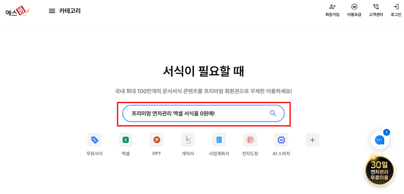 1. 홈페이지 중앙에 있는 검색창을 통해 필요한 서식을 손쉽게 찾아볼 수 있습니다. '프리미엄 연차관리 엑셀 서식 0원에!'처럼 현재 진행 중인 유용한 정보도 바로 확인할 수 있어 편리합니다. 원하는 문서 종류를 입력하고 검색하면 됩니다.
