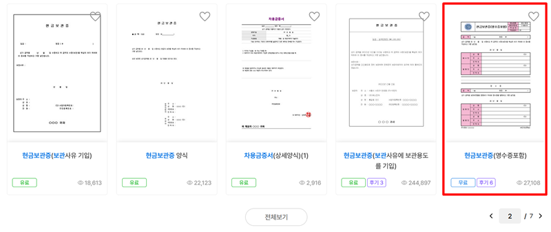 4. 여러 서식 중에서 '현금보관증(영수증포함)'과 같이 무료로 이용할 수 있는 항목을 선택하는 것이 좋습니다. '유료'와 '무료' 표시를 잘 확인하고, 조회수나 후기를 참고하여 많은 사람들이 사용하는 문서를 고르는 것도 좋은 방법입니다.