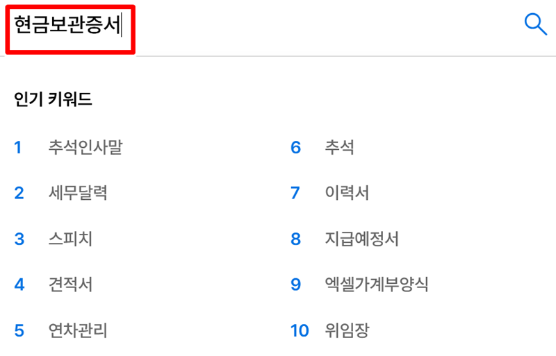 2. 검색창에 '현금보관증'이라고 직접 입력하면 관련된 다양한 문서들을 찾아볼 수 있습니다. '추석인사말', '이력서' 등 인기 키워드도 참고할 수 있어 현재 많은 사람들이 어떤 문서를 찾고 있는지 파악하는 데 도움이 됩니다.
