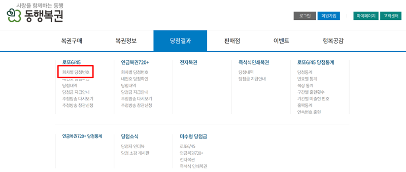 2. '당첨결과' 위로 마우스를 가져가면 아래로 여러 선택지가 나타나요. 로또 6/45 항목 아래에 있는 '회차별 당첨번호'를 선택해 주세요. 연금복권이나 다른 복권 정보도 있지만, 우리가 찾고 있는 전체 번호 모음을 보려면 이곳으로 들어가야 한답니다.