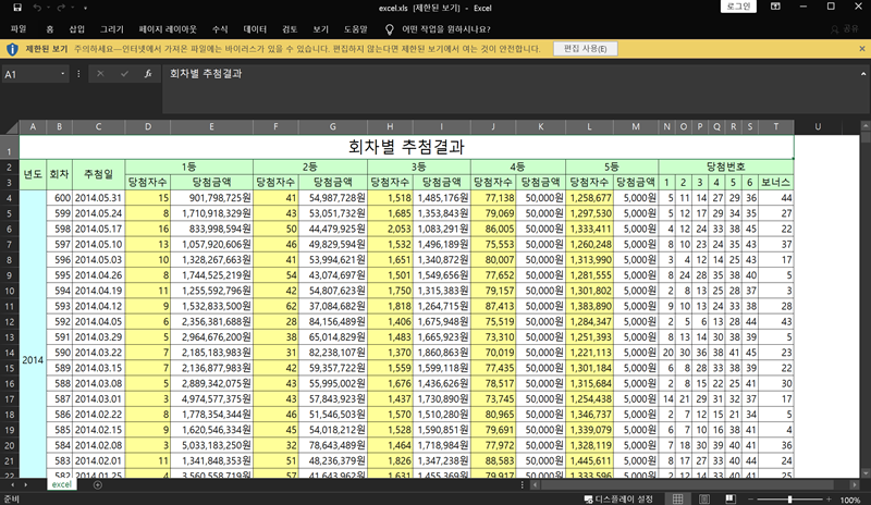 로또당첨번호 전체모음 엑셀로 한눈에 보기