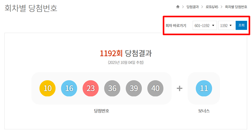 3. 페이지가 바뀌면 특정 회차의 당첨 결과를 조회할 수 있는 화면이 나타나요. 상단에 있는 '회차 바로가기' 부분을 통해 원하는 회차의 번호를 바로 찾아볼 수도 있고, 범위를 지정해서 검색하는 것도 가능해요. 최신 회차부터 과거 회차까지 모두 찾아볼 수 있습니다.