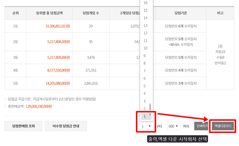4. 화면을 아래로 쭉 내리면 등수별 당첨금액과 당첨 기준 등이 상세하게 나와있는 표가 보일 거예요. 이 표 바로 아래를 보면 '엑셀다운로드'라는 글씨를 발견할 수 있습니다. 여기서 원하는 회차 범위를 정한 뒤 이 부분을 눌러주면 파일 저장이 시작돼요.