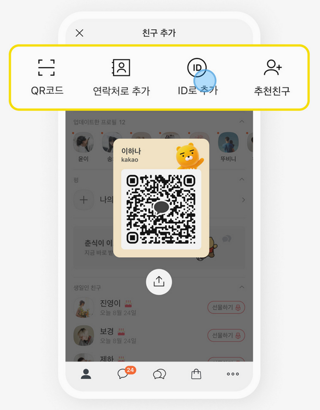 5. 카카오톡 ID로 친구 찾기를 통해 연락 해볼 수 있는데요. 친구의 카카오톡 ID 찾아 검색하면 해당 ID가 있는 친구가 나타납니다. 친구를 선택하고 '친구 추가' 버튼을 누르면 카카오톡 친구 목록에 추가됩니다. 이렇게 해서 ID로 쉽게 친구를 추가해서 연락 해볼 수 있습니다.