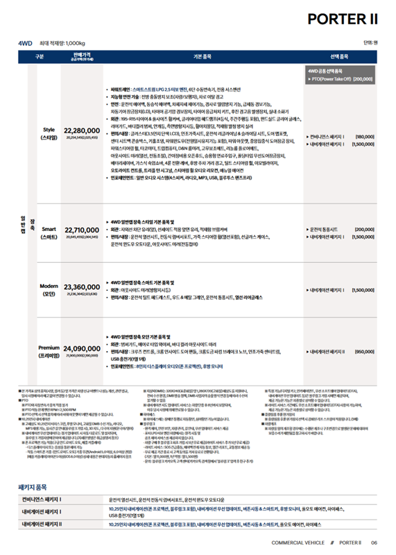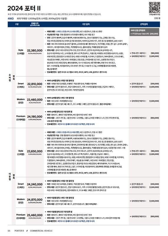 2. 파일을 열면 2024년형 포터 II의 가격표를 가장 먼저 확인하게 됩니다. 표는 구동 방식(2WD)과 차체 종류(초장축 슈퍼캡)에 따라 구분되어 있어요. 스타일, 스마트, 모던, 프리미엄 각 등급별 기본 판매 가격과 기본으로 적용되는 품목들이 무엇인지 상세하게 나와 있습니다.