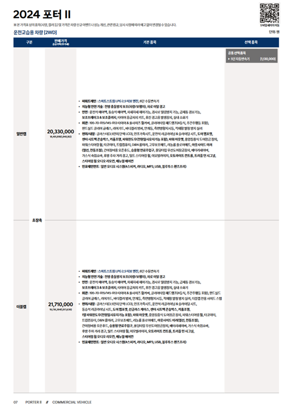 6. 가격표 후반부에는 일반캡과 같은 다른 운전석 형태나 운송 목적에 맞춘 특장차에 대한 가격 정보도 담겨 있습니다. 이를 통해 아주 다양한 종류의 포터가 있다는 것을 알 수 있고, 나의 사용 목적에 가장 적합한 모델을 찾는 데 도움을 줍니다.