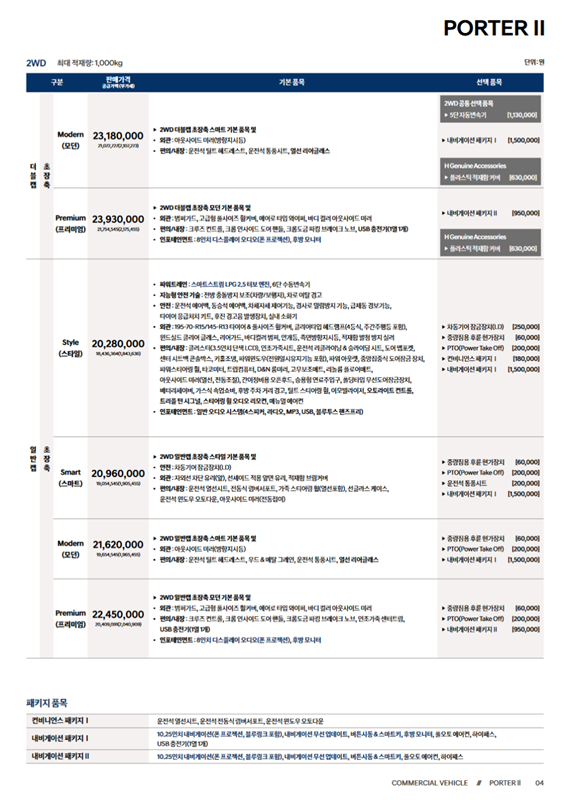 2. 파일을 열면 2024년형 포터 II의 가격표를 가장 먼저 확인하게 됩니다. 표는 구동 방식(2WD)과 차체 종류(초장축 슈퍼캡)에 따라 구분되어 있어요. 스타일, 스마트, 모던, 프리미엄 각 등급별 기본 판매 가격과 기본으로 적용되는 품목들이 무엇인지 상세하게 나와 있습니다.