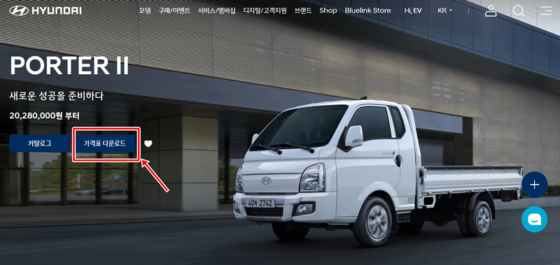 1. 현대자동차 홈페이지에 있는 포터 II 소개 화면에 들어가면 차량 이미지 아래로 '카탈로그'와 '가격표 다운로드'라는 항목을 볼 수 있습니다. 여기서 오른쪽에 있는 '가격표 다운로드'를 선택하면 자세한 내용이 담긴 파일을 받을 수 있습니다.