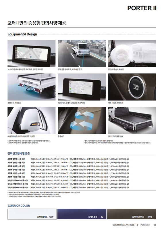 7. 마지막 페이지에서는 차량의 주요 편의 사양과 안전 사양들을 이미지와 함께 소개합니다. 10.25인치 내비게이션이나 후방 모니터 같은 기능들을 시각적으로 보여주며, 정부 신고 연비 및 등급 정보와 선택 가능한 외장 색상 정보까지 제공하여 차량에 대한 이해를 돕습니다.