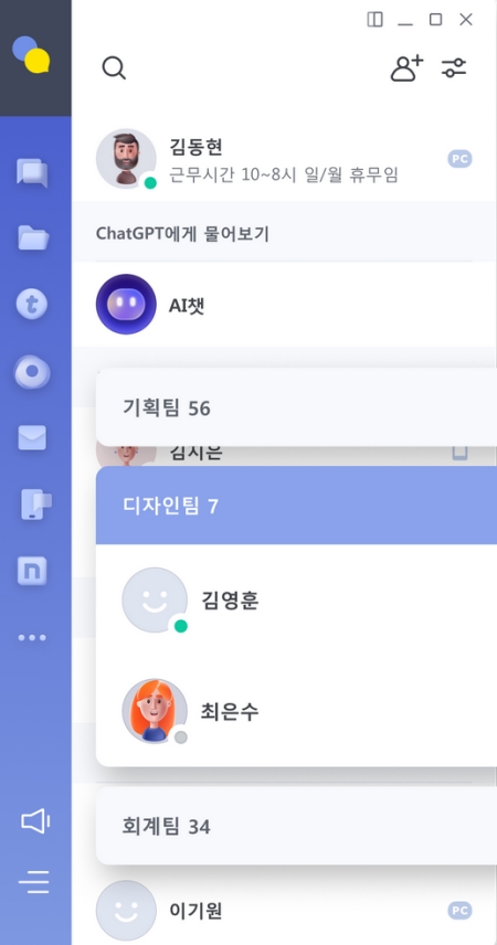 9. 메인 화면에서는 친구 목록을 비롯해 팀룸, AI챗 등 다양한 메뉴를 한눈에 확인할 수 있습니다. 조직도 기반으로 구성된 친구 목록은 팀원들을 쉽게 찾고 소통할 수 있도록 도와주어 업무 효율을 높여줍니다.