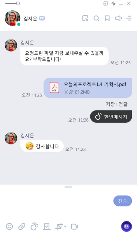 5. 네이트온의 기본 대화창에서는 간단한 메시지 전송은 물론, 문서나 이미지 파일을 손쉽게 주고받을 수 있습니다. 또한, 상대방이 확인하면 자동으로 사라지는 '한번메시지' 기능으로 보안이 필요한 내용도 부담 없이 전달할 수 있어요.