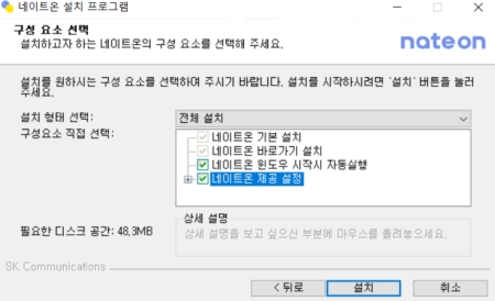 3. 다음은 구성 요소를 선택하는 화면입니다. 네이트온 기본 설치 외에 바로 가기 생성, 윈도우 시작 시 자동 실행 여부 등을 정할 수 있습니다. 필요한 항목을 확인하고 '설치'를 눌러주세요.
