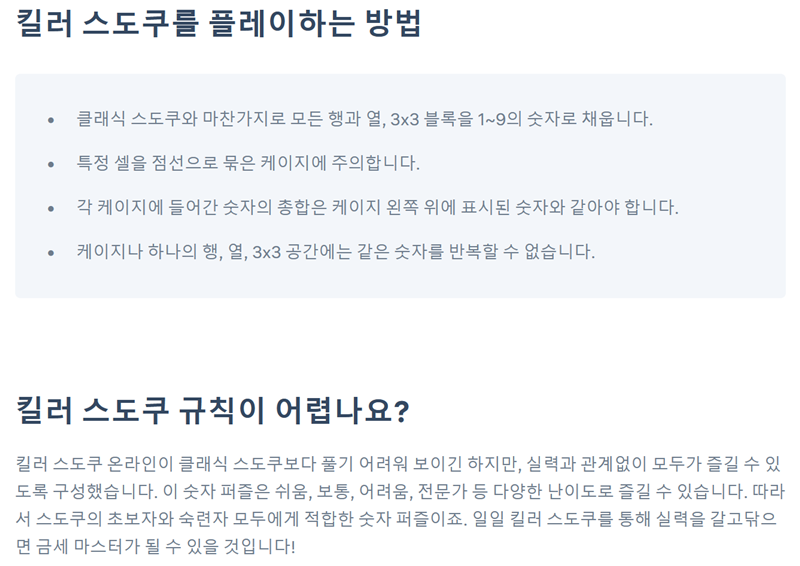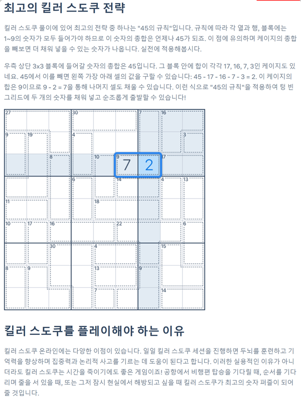 8. 플레이 방법은 기존 방식과 비슷하지만 몇 가지 추가 규칙에 주의해야 합니다. 모든 행과 열, 3x3 블록을 1부터 9까지의 숫자로 채워야 하고, 각 케이지에 들어간 숫자의 합은 케이지에 표시된 숫자와 같아야 합니다. 또한, 하나의 케이지 안에서는 같은 숫자를 반복할 수 없습니다.
