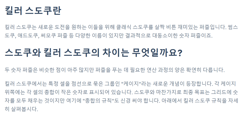 7. 이 새로운 방식의 퍼즐에서는 점선으로 묶인 '케이지'라는 개념이 등장합니다. 각 케이지의 왼쪽 위에는 작은 숫자가 표시되는데, 이것은 그 케이지 안에 들어갈 숫자들의 합을 의미합니다. 기존 규칙과 합계 규칙을 동시에 신경 써야 하는 것이 특징입니다.