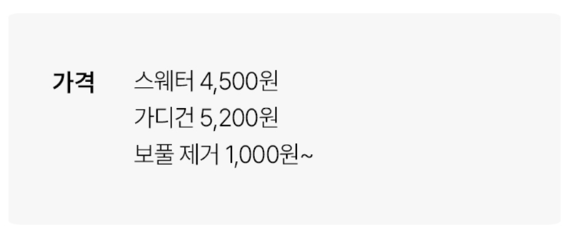 7. 스웨터는 4,500원, 가디건은 5,200원부터 세탁할 수 있으며, 보풀 제거는 1,000원부터 추가로 이용할 수 있습니다. 겨울철 자주 입는 스웨터류를 깔끔하게 관리할 수 있겠네요.