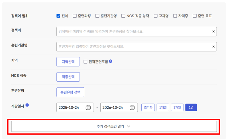 3. 훈련 과정 검색 화면으로 이동하면 다양한 조건으로 과정을 찾아볼 수 있습니다. 여기서 더 상세한 조건을 설정하기 위해 화면 하단에 위치한 '추가 검색조건 열기'를 눌러줍니다. 이 기능을 활용하면 훈련 유형, 주말/야간 여부 등 개인의 상황에 맞는 과정을 보다 쉽게 찾을 수 있습니다.