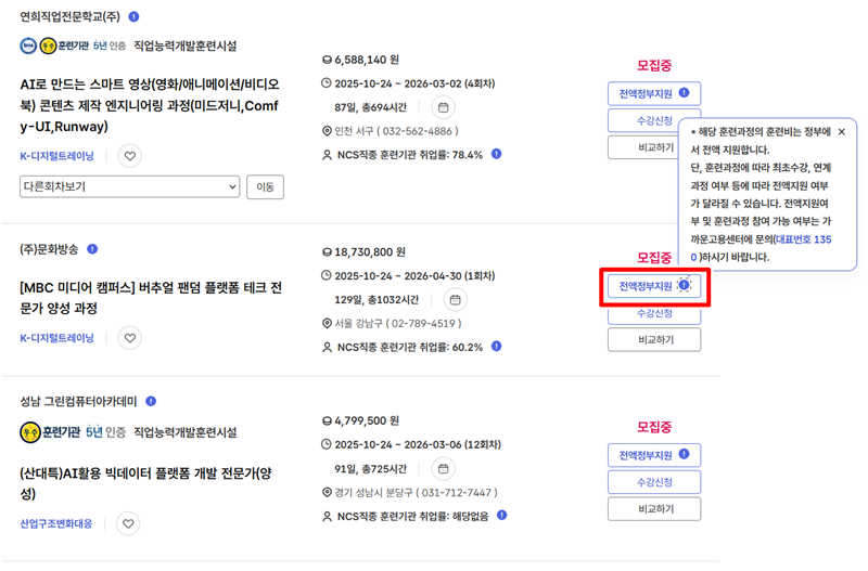 5. 검색 결과 화면에서는 무료로 수강할 수 있는 다양한 훈련 과정 목록이 나타납니다. 이 중에서 관심 있는 과정을 찾고, '전액정부지원' 표시를 확인한 후 '수강신청'을 진행하면 됩니다. 과정을 비교해보고 자신에게 가장 적합한 교육을 선택하는 것이 좋습니다.