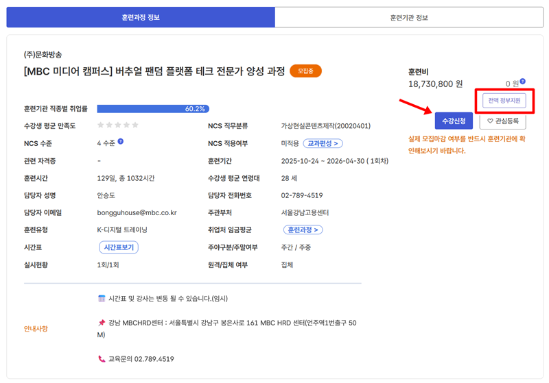 6. 마음에 드는 과정을 선택하여 상세 페이지로 이동하면 훈련비가 '전액 정부지원'으로 표시된 것을 최종적으로 확인할 수 있습니다. 훈련 내용, 기간, 시간 등을 꼼꼼히 살펴본 후 '수강신청'을 진행하여 자기 계발을 위한 교육을 시작할 수 있습니다.