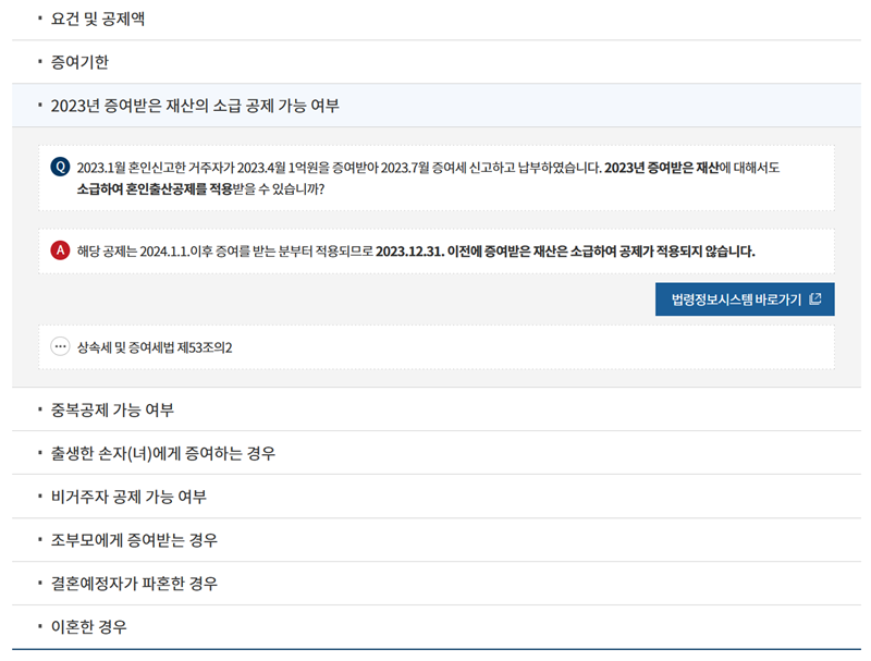6. 증여 기한에 대한 질문에서는 2022년 7월 1일에 혼인신고를 했더라도, 2024년 1월 1일 이후부터 2024년 7월 1일 사이에 증여받는다면 혼인·출산 공제가 적용된다는 답변을 볼 수 있습니다. 즉, 증여받은 날짜가 중요하다는 것을 알 수 있습니다.