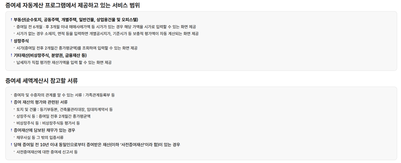 4. 계산 서비스를 이용하기 전, 자동계산이 가능한 재산의 범위와 실제 신고 시 필요한 서류 목록을 안내해 줍니다. 부동산, 주식 등 다양한 자산에 대한 안내가 있지만, 현금 증여의 경우엔 비교적 간단하게 진행할 수 있으니 내용을 가볍게 확인하고 넘어가면 됩니다.