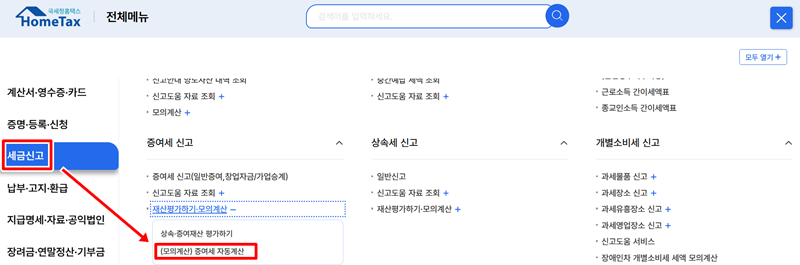 2. 전체 메뉴가 나타나면 '세금신고' 항목을 찾아주세요. 그 아래에 있는 여러 세금 종류 중에서 '증여세 신고'를 선택한 후, 오른쪽에 보이는 '[모의계산] 증여세 자동계산'으로 들어가면 관련 서비스를 이용할 수 있는 화면으로 이동합니다.