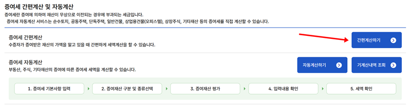 3. 증여세 간편계산과 자동계산 두 가지 항목이 나타납니다. 증여받은 재산의 가액을 이미 알고 있는 경우라면 '증여세 간편계산'의 '간편계산하기'를 통해 더 빠르고 간단하게 예상 세액을 확인해 볼 수 있습니다.