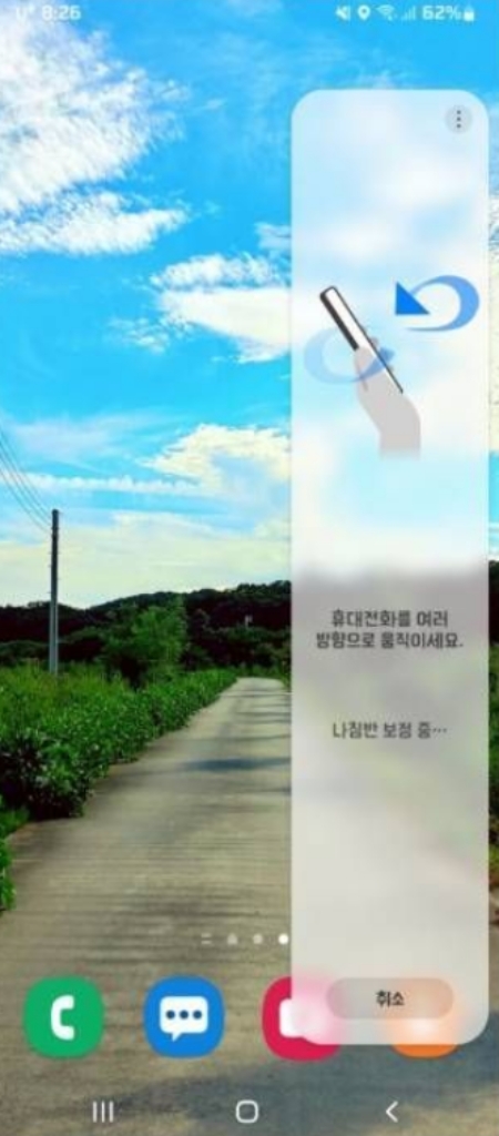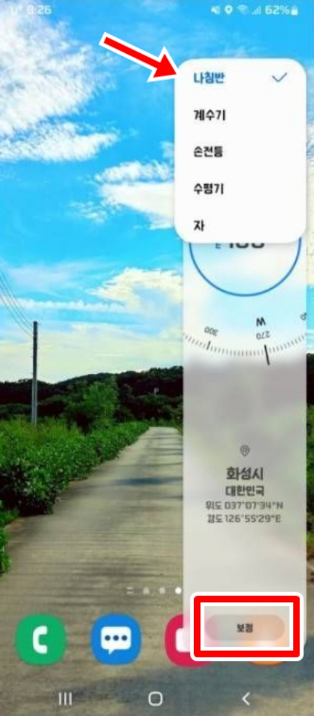 7. 만약 나침반의 방향이 정확하지 않다고 느껴진다면 보정 작업을 거치는 것이 좋습니다. 패널 하단의 '보정' 항목을 선택하면, 화면의 안내에 따라 휴대폰을 여러 방향으로 움직이게 됩니다. 이 과정을 통해 센서가 초기화되어 더욱 정확한 값을 표시해 줍니다.