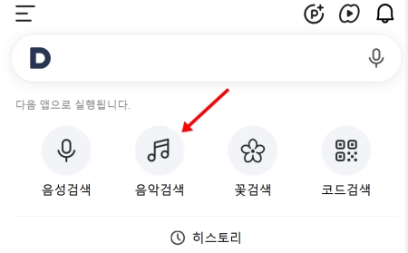 2. 음성검색, 음악검색, 꽃검색, 코드검색 네 가지 항목 중에서 두 번째에 위치한 '음악검색'을 선택해 주세요. 음표 모양으로 되어 있어 한눈에 알아보기 쉬우며, 현재 재생 중인 음악을 찾는 데 사용됩니다.