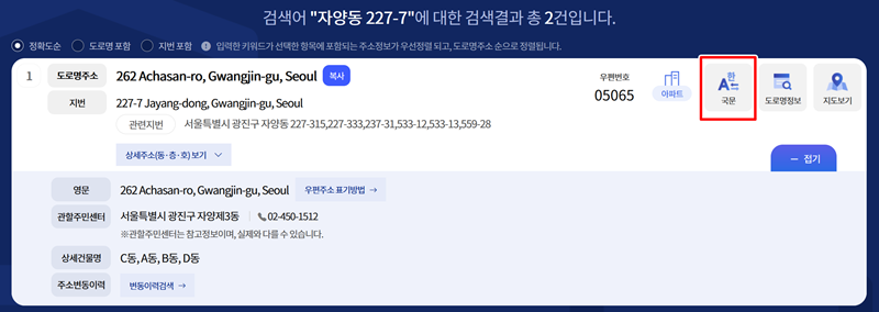 6. 또한, 검색 결과 화면에서 '영문' 항목을 선택하면 해당 도로명주소의 영문 표기를 바로 확인할 수 있습니다. 해외 우편물을 보내거나 받을 때 유용하게 활용할 수 있는 정보입니다.