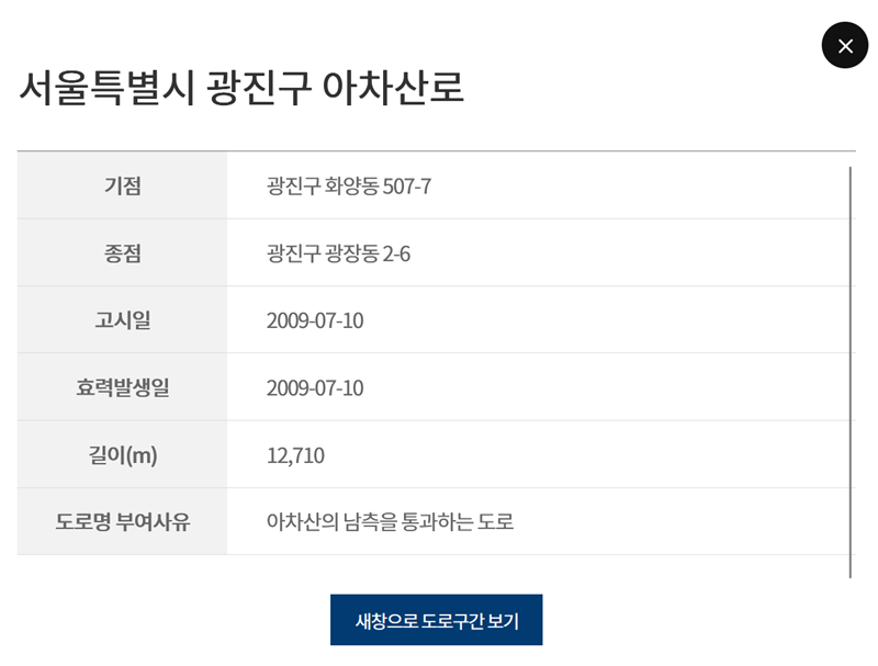 5. '도로명정보'를 확인하면 해당 도로가 시작되는 지점과 끝나는 지점, 도로의 총 길이, 그리고 도로명이 부여된 이유 등 주소에 담긴 구체적인 배경 정보까지 살펴볼 수 있습니다.