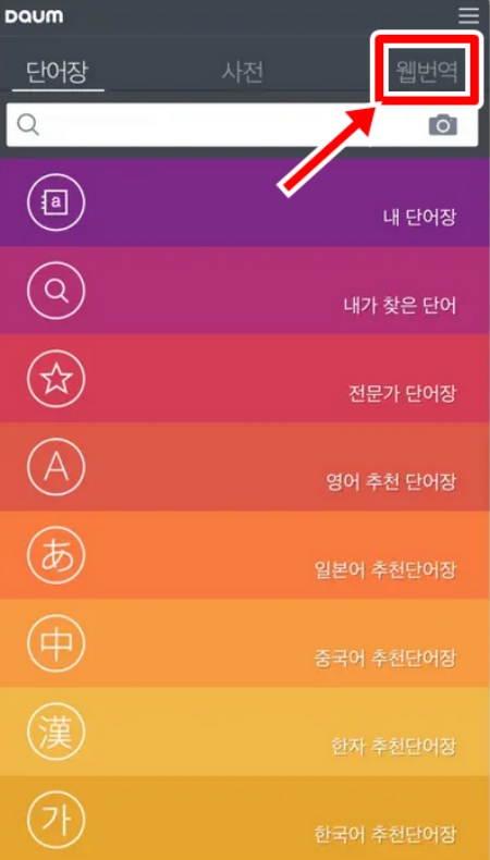 5. 화면 상단에는 단어장, 사전과 함께 '웹번역' 기능이 있습니다. 외국 웹사이트의 주소를 입력하면 페이지 전체를 번역해 주어 해외 자료를 볼 때 유용합니다.