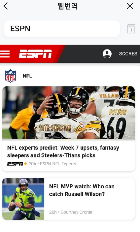 6. '웹번역'을 선택하고 주소창에 원하는 사이트 주소를 입력하면 해당 페이지로 이동합니다. 기사나 정보성 글을 원래의 레이아웃 그대로 번역된 내용으로 볼 수 있습니다.