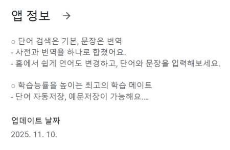 2. 앱 정보에서 주요 기능들을 미리 살펴볼 수 있습니다. 단어 검색은 물론 문장 번역 기능이 하나로 합쳐져 있으며, 단어 자동 저장 같은 학습 능률을 높여주는 기능도 있습니다.