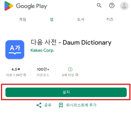 1. 구글 플레이스토어에서 '다음 사전'을 검색한 후, 설치를 진행하여 앱을 실행할 준비를 합니다. 설치가 완료되면 바탕화면이나 앱 서랍에서 아이콘을 확인할 수 있습니다.