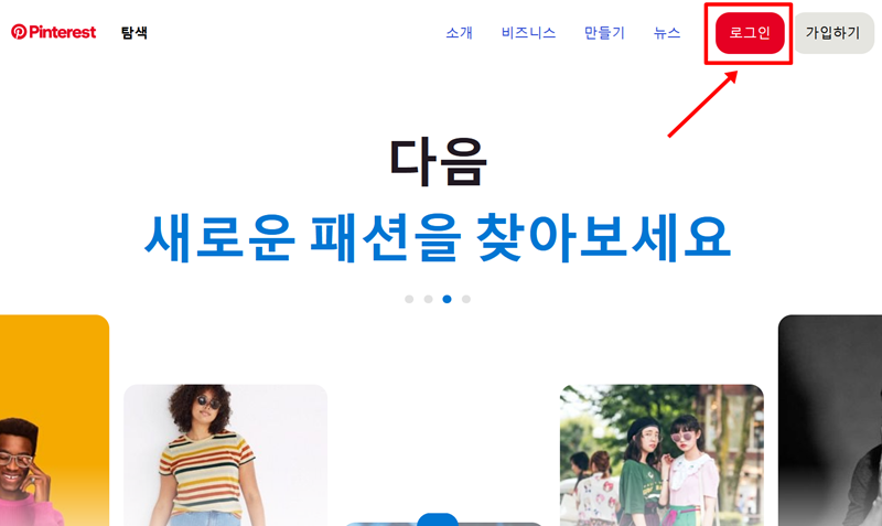 1. Pinterest 홈페이지에 접속하면 오른쪽 상단에 있는 '로그인' 항목을 통해 서비스를 이용할 수 있습니다.