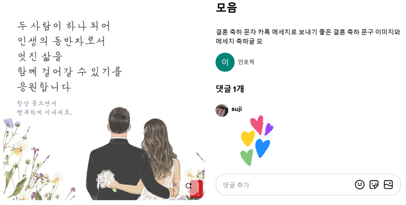 5. 선택한 이미지를 보면 '두 사람이 하나 되어 인생의 동반자로써 멋진 삶을 함께 걸어갈 수 있기를 응원합니다'와 같은 실제 축하 메시지 예시와 함께 댓글을 남기는 공간도 확인할 수 있습니다.