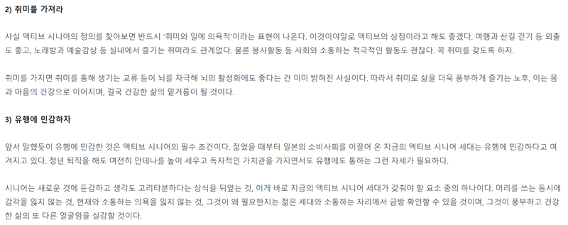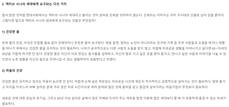 3. 활기찬 노년, 즉 '액티브 시니어'가 되기 위해서는 몇 가지 조건이 필요합니다. 건강한 몸과 마음은 기본이며, 꾸준한 자기 관리를 통해 신체 변화에 대처해야 합니다. 또한, 유행에 뒤처지지 않는 감각과 풍부한 경험을 젊은 세대와 나누려는 열린 자세도 중요합니다. 이러한 요소들이 어우러질 때 진정으로 멋진 노년의 삶을 살아갈 수 있습니다.