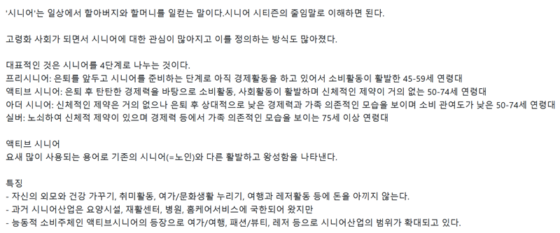 1. 시니어는 일반적으로 은퇴를 앞두거나 은퇴한 중장년층을 의미하며, 활동 수준에 따라 여러 단계로 나뉩니다. '프리시니어'는 45~59세로 은퇴를 준비하는 단계이며, '액티브 시니어'는 50~74세 중 경제력을 바탕으로 활발한 소비와 사회활동을 하는 계층입니다. 반면 '실버'는 75세 이상으로 신체적, 경제적으로 의존적인 모습을 보이는 연령대를 말합니다.