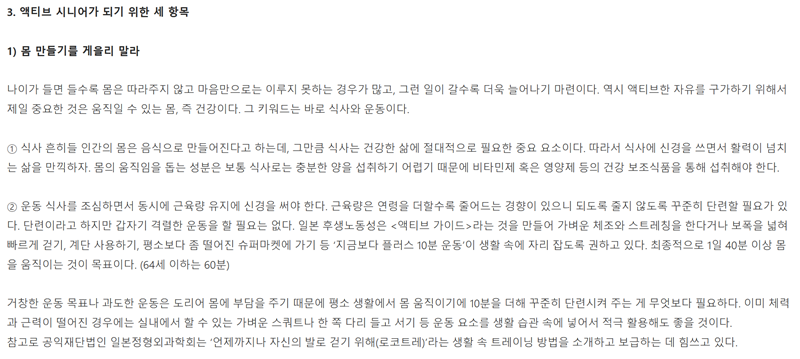 3. 활기찬 노년, 즉 '액티브 시니어'가 되기 위해서는 몇 가지 조건이 필요합니다. 건강한 몸과 마음은 기본이며, 꾸준한 자기 관리를 통해 신체 변화에 대처해야 합니다. 또한, 유행에 뒤처지지 않는 감각과 풍부한 경험을 젊은 세대와 나누려는 열린 자세도 중요합니다. 이러한 요소들이 어우러질 때 진정으로 멋진 노년의 삶을 살아갈 수 있습니다.