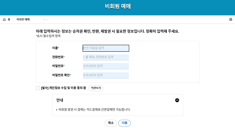9. 마지막으로 이름과 전화번호, 그리고 예매 확인에 필요한 5자리 비밀번호를 입력하면 됩니다. 이 정보는 나중에 승차권을 확인하거나 변경할 때 필요하므로 정확하게 기입해야 합니다.