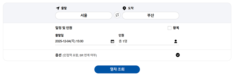 4. 이제 본격적으로 여정을 설정할 차례입니다. 출발지와 도착지를 입력하고, 여행을 떠날 날짜와 시간, 그리고 함께하는 인원수를 정확하게 맞춘 뒤 '열차 조회'를 눌러주세요.