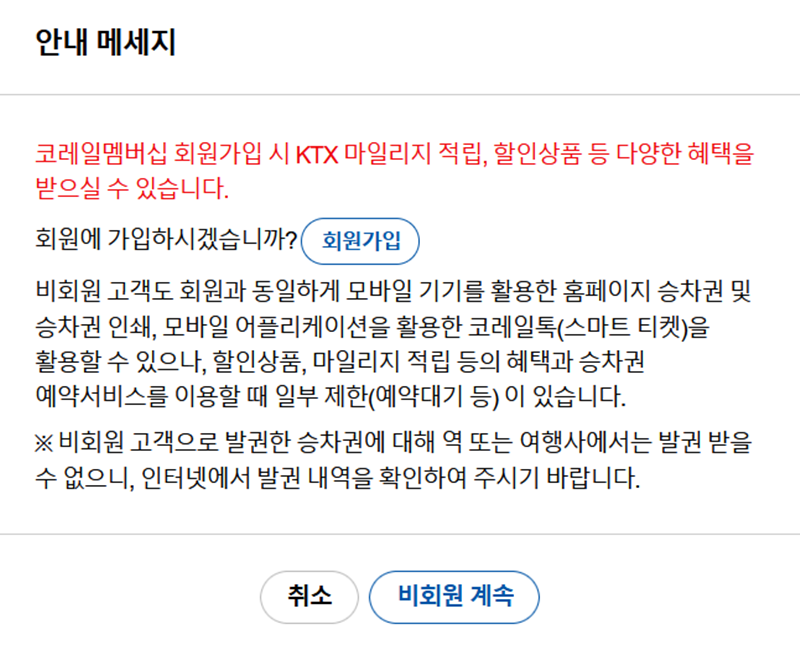 8. 비회원으로 진행할 경우, 회원가입 시 받을 수 있는 혜택에 대한 안내가 나타납니다. 내용을 확인한 후 '비회원 계속'을 선택하여 절차를 이어갈 수 있습니다.