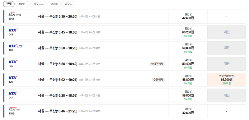 6. 마음에 드는 시간대의 열차를 골랐다면, 일반실 또는 특실의 운임을 확인한 후 '예매'를 진행하면 됩니다. 매진된 시간대는 선택이 불가능하니 다른 시간대를 살펴보는 것이 좋습니다.